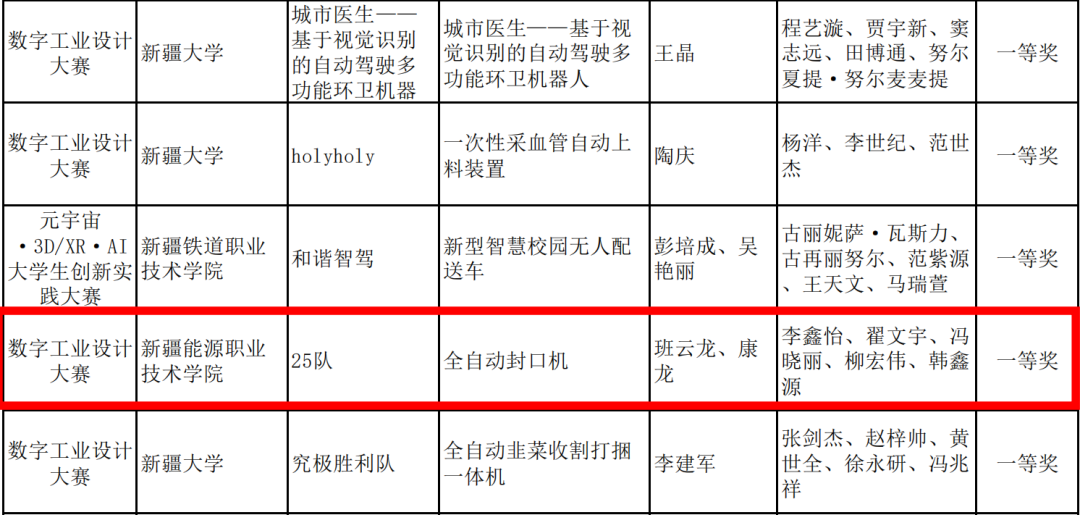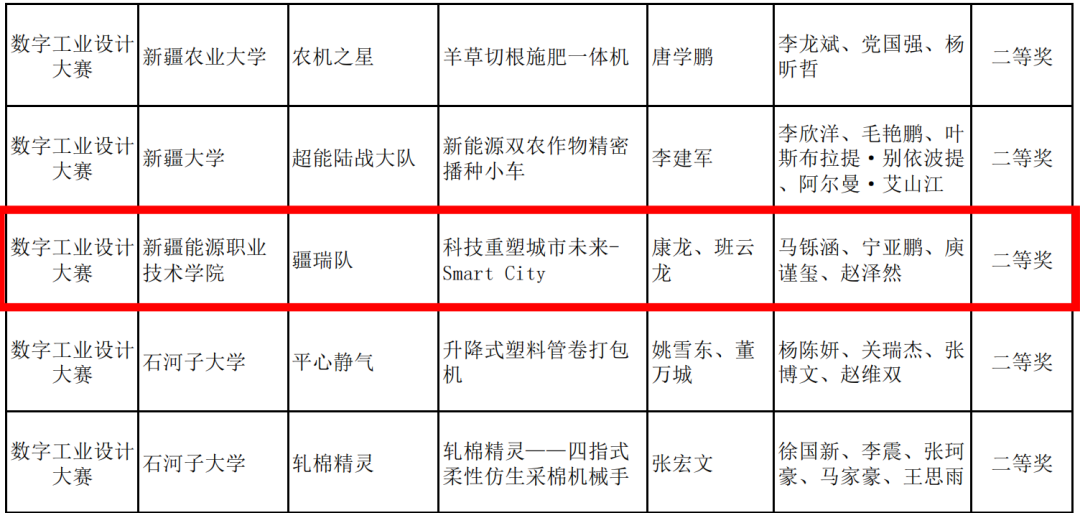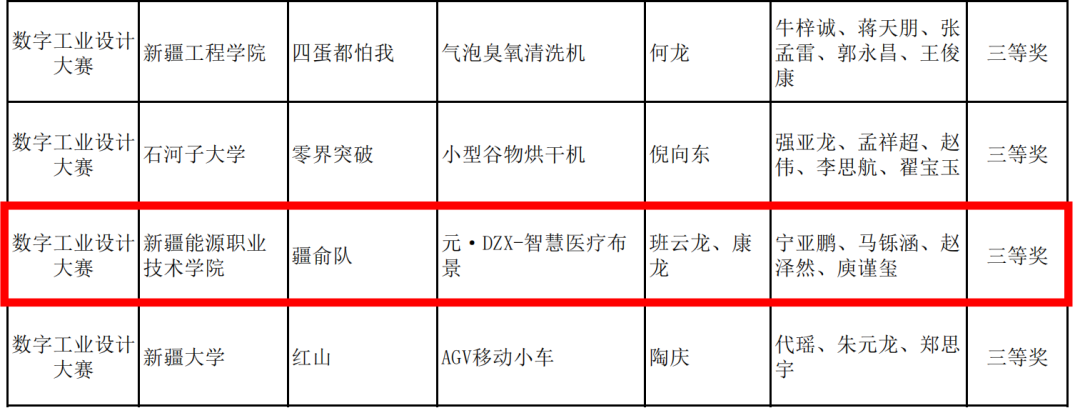 近日,在全国三维数字化创新设计大赛17周年精英联赛-新疆赛区(2024-2025年度)中,学院电子信息系3支参赛队伍在班云龙、康龙两位老师指导下,荣获新疆赛区一等奖一项、二等奖一项、三等奖一项。
