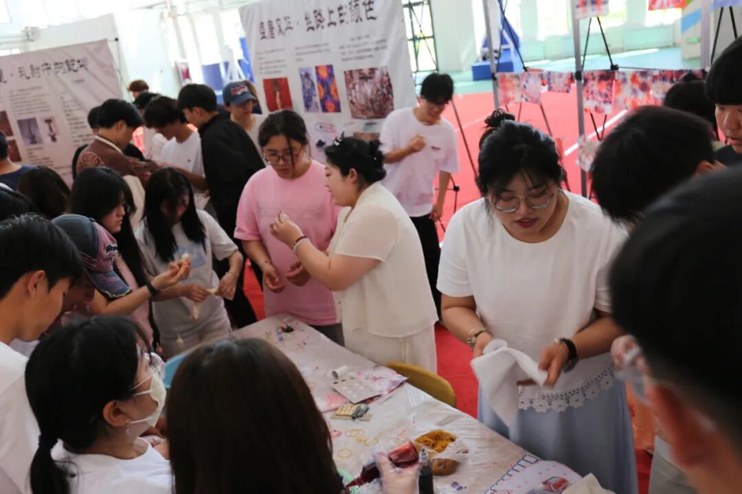 运用草木染料氧化还原原理,学子们以皮筋构建物理阻染区,在靛蓝渐变中复现"青出于蓝"的染缬技艺。