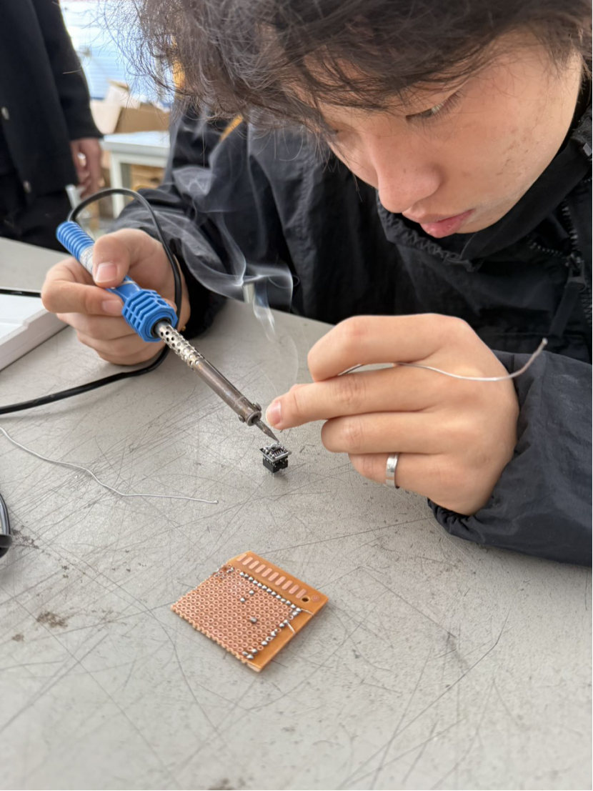 大家在老师的指导下,有条不紊地接线、焊接、调试电压电表。一开始,不少同学因紧张出现电烙铁拿不稳、焊锡丝送料时机不对、电路接线不通电等问题。老师们耐心地一对一指导,手把手纠正错误。同时,以团队协作学习模式,让学生分组完成焊接项目任务,组内成员根据自身优势分工协作,在交流合作中共同进步,最终完成了台灯、收音机、计算器、时钟等焊接调试。