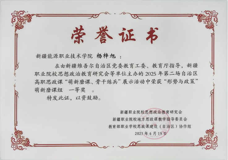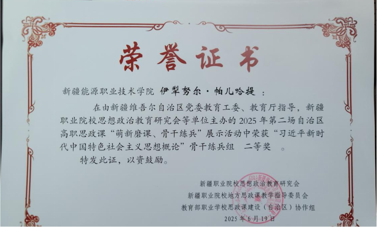 6月18日至20日,由新疆维吾尔自治区党委教育工委、自治区教育厅指导,新疆职业院校思想政治教育研究会主办的2025年(第二场)自治区高职思政课“萌新磨课、骨干练兵”展示活动在新疆农业职业技术大学顺利举行。此次比赛共有来自全疆22所高职院校同台竞技,经过激烈角逐,学院马克思主义教研部杨梓旭老师荣获“形势与政策”萌新磨课组一等奖,伊犁努尔老师获“习近平新时代中国特色社会主义思想概论”骨干组二等奖。