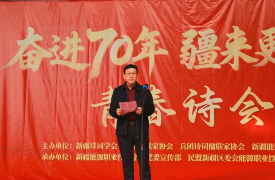 诗会在热情洋溢的致辞中拉开帷幕。新疆诗词学会会长、新疆楹联家协会主席、新疆生产建设兵团诗联家协会副主席赵英、新疆楹联家协会党支部书记徐延利分别致辞。学校党委委员、统战部部长、副校长刘红春代表学校向莅临嘉宾表示欢迎,向各合作单位及筹备师生致以诚挚感谢。他指出,本次诗会是深化校园文化建设、落实“文化润疆”的重要举措,对激发师生爱党爱国爱疆情怀具有重要意义,并预祝活动圆满成功。